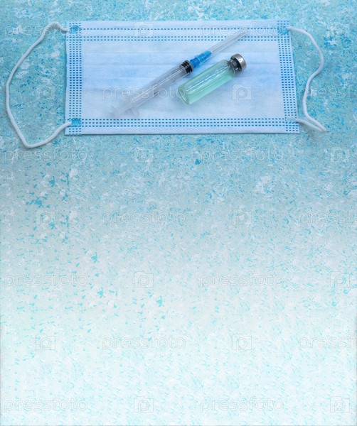 Медицинские инструменты на синем фоне. Ампула лекарства и шприц. Медицинская маска и вакцина