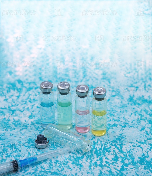 Медицинские ампулы, шприцы и маска на зеленом фоне. Вакцинация против ковид-19