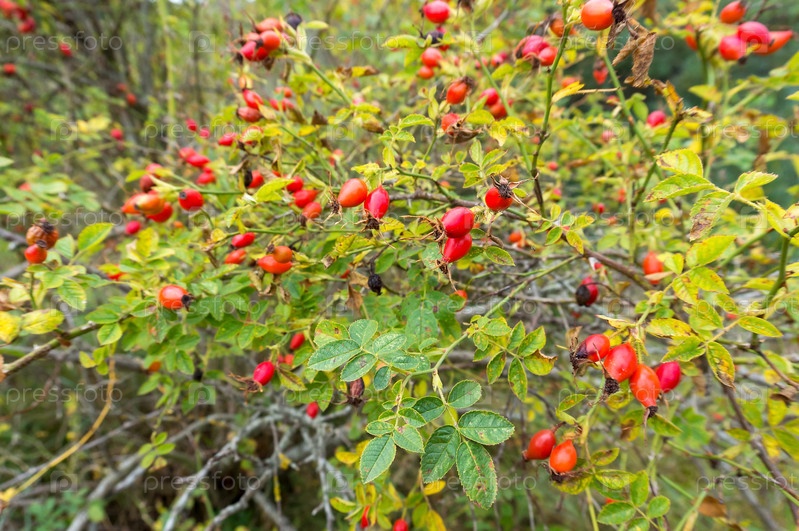 Красные ягоды шиповника. Лекарственные ягоды. Дикая роза. Бедренный куст