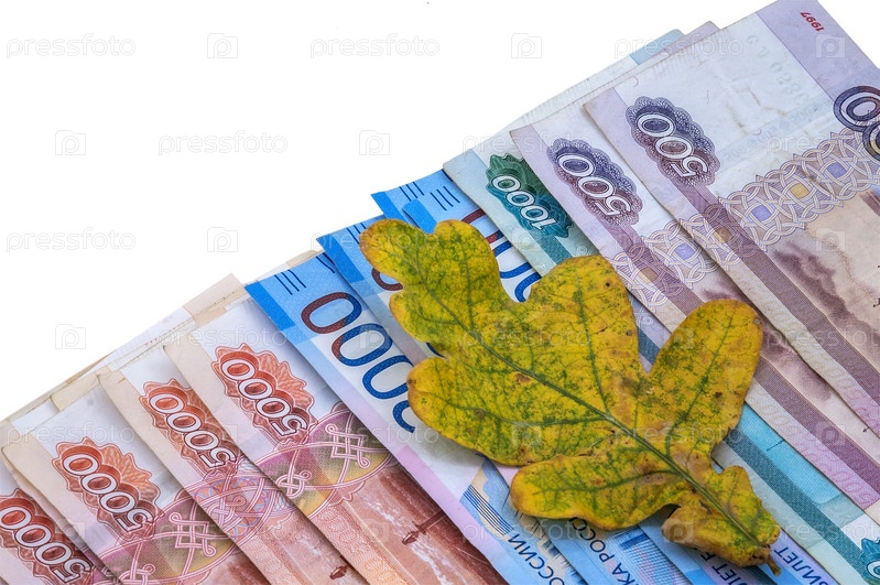 Рубли и осенний лист. Желтый дубовый лист на фоне денег. Осенние акции и распродажи