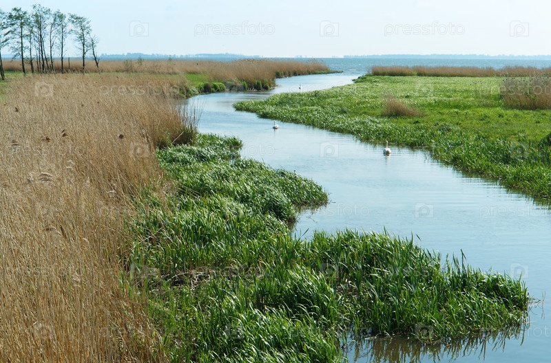 Река впадает в море, небольшая речка с птицами, заросшие берега реки