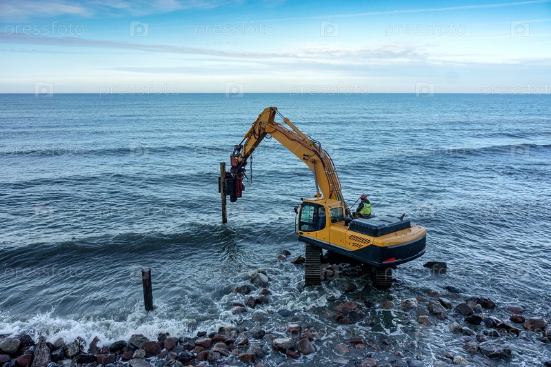 Манипулятор работает со сваями. Строительство волноломов в море