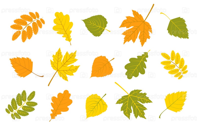 Набор осенних красочных листьев. Листья клена, березы. Листья рябины и грецкого ореха. Дубовые листья. В наборе на белом фоне