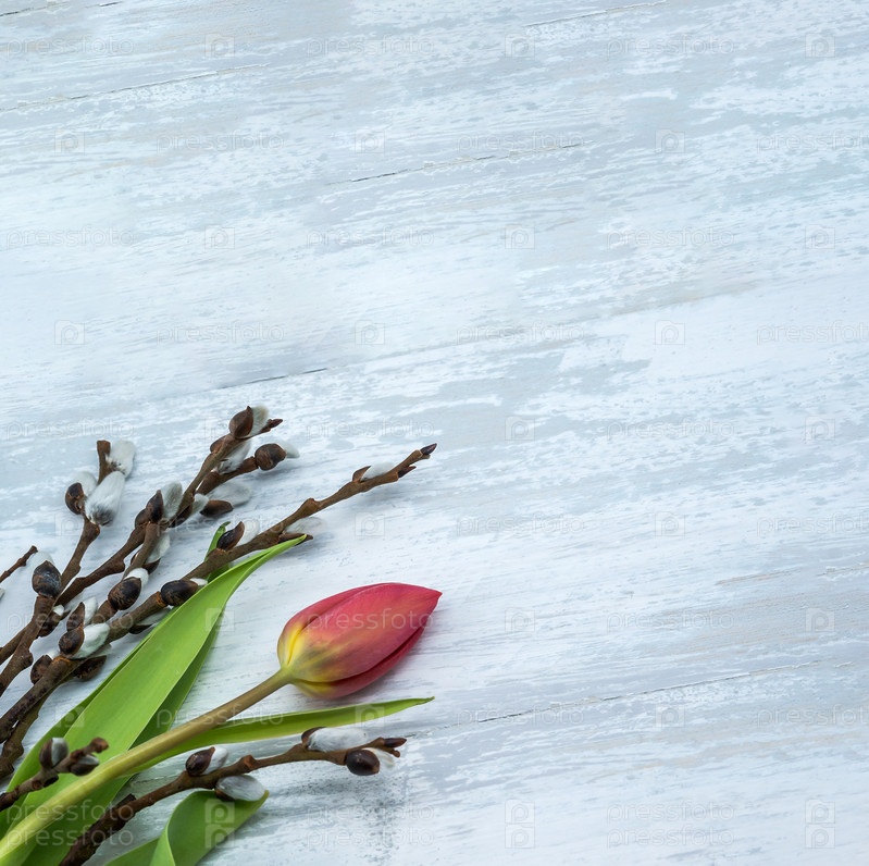 Тюльпаны и ива на сером фоне. Красные тюльпаны и пушистая ива на светлом фоне