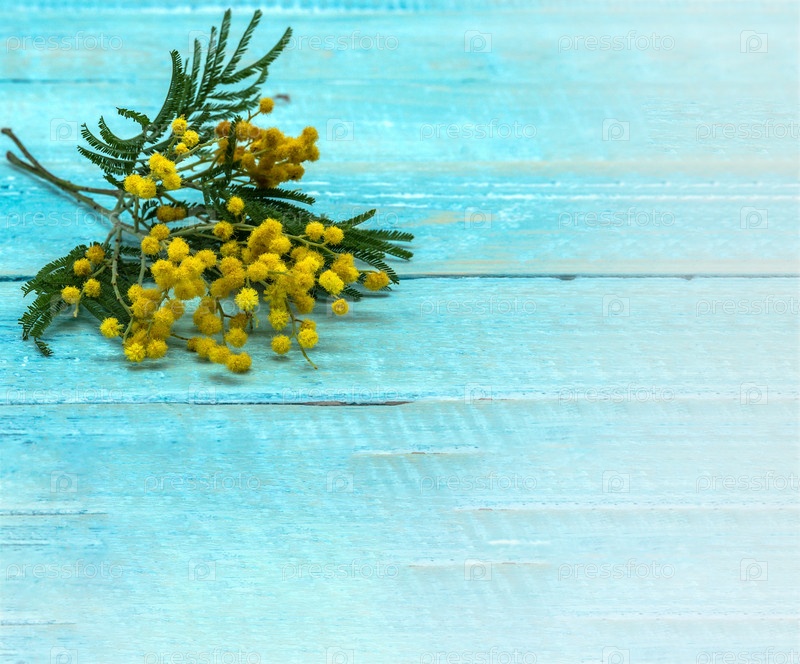Ветка мимозы на деревянном фоне