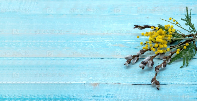 Ветви мимозы и ивы на деревянном фоне. Мимоза и Ива на синем фоне