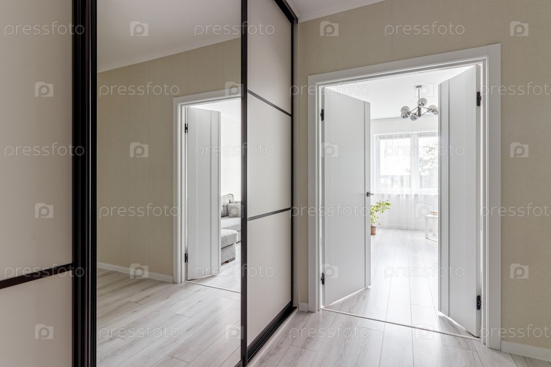 Интерьер просторной пустой отремонтированной гостиной с побеленными стенами, ламинированным полом и белой дверью
