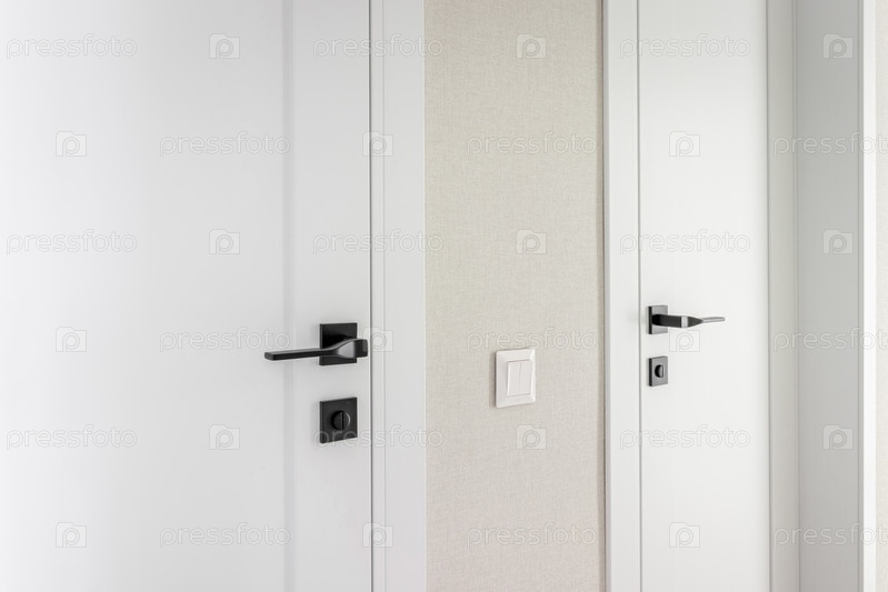Современная черная дверная ручка на белой деревянной двери в интерьере. Элементы крупного плана ручки