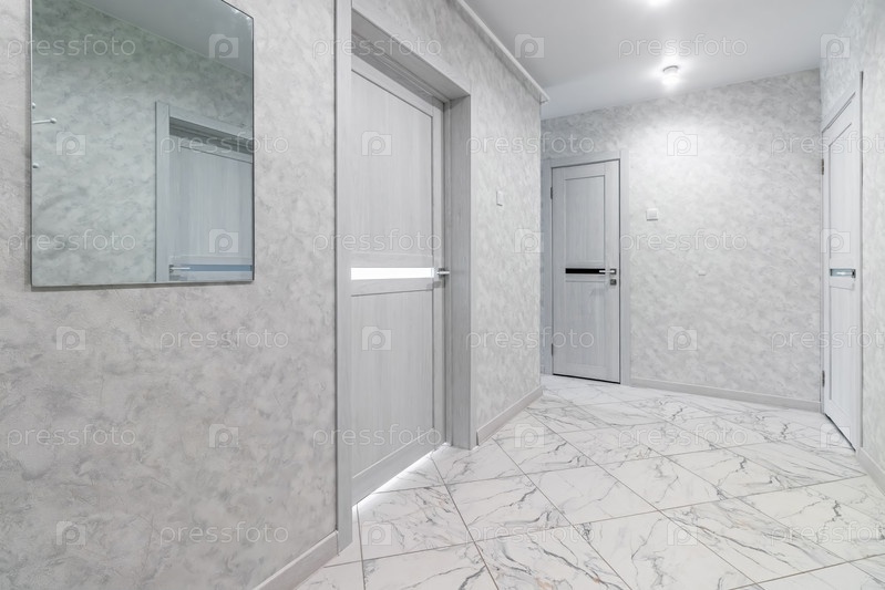 Пустой серый коридор в современной гостиной без мебели и с закрытыми дверями