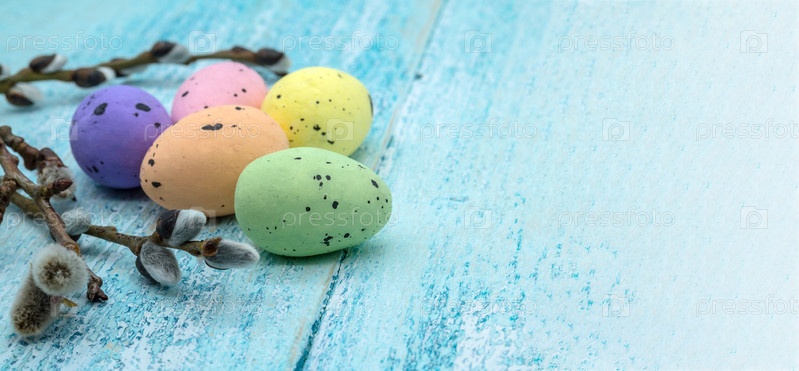 Веточки ивы. Пасхальные яйца. Христос воскрес. Синий фон