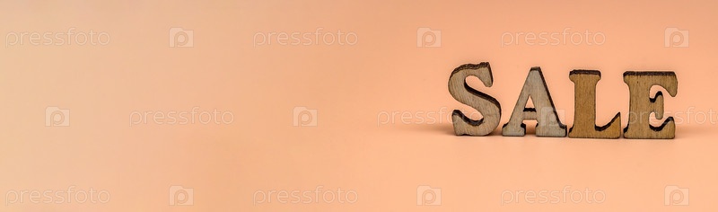 Продажа больших букв, акция. Распродажа со скидкой. Скидка на деревянные буквы на оранжевом фоне