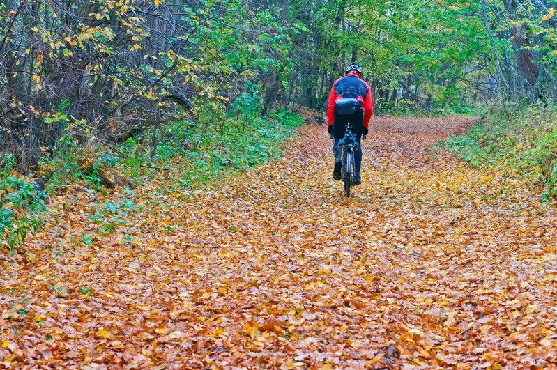 Велосипедист едет по опавшим красным и желтым листьям на велосипеде в осеннем лесу