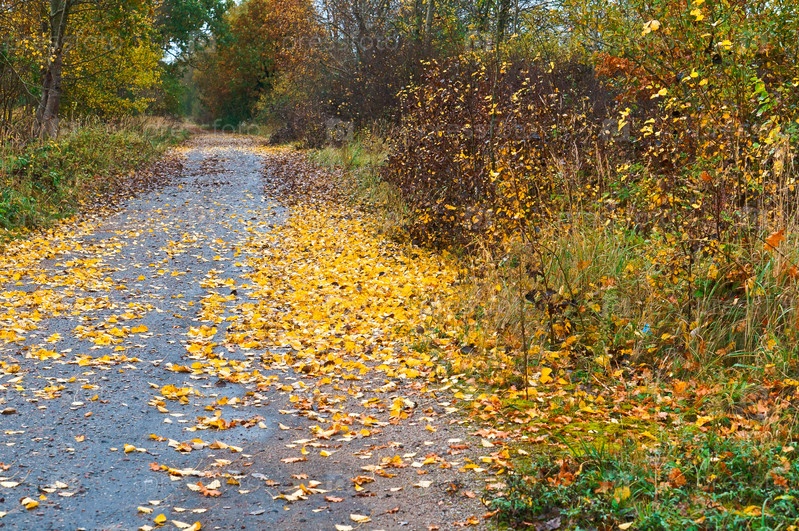 Осенний лес, дорога, покрытая опавшими осенними листьями