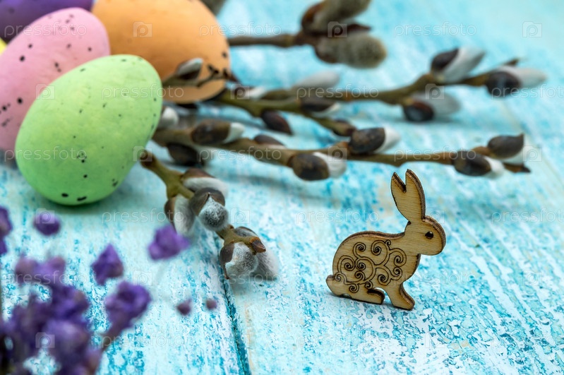 Пасхальный кролик. Веточки ивы. Пасхальные яйца. Христос воскрес. Синий фон