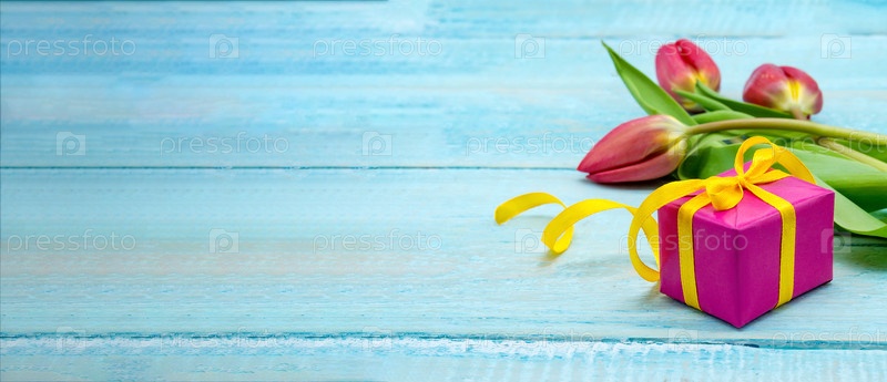 Весенние цветы и подарочная коробка. Красные тюльпаны и красная упаковка