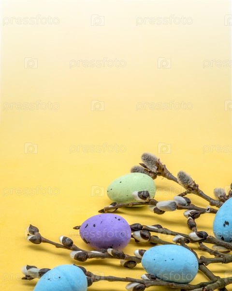 Пасхальные яйца. Веточки ивы. Желтый фон