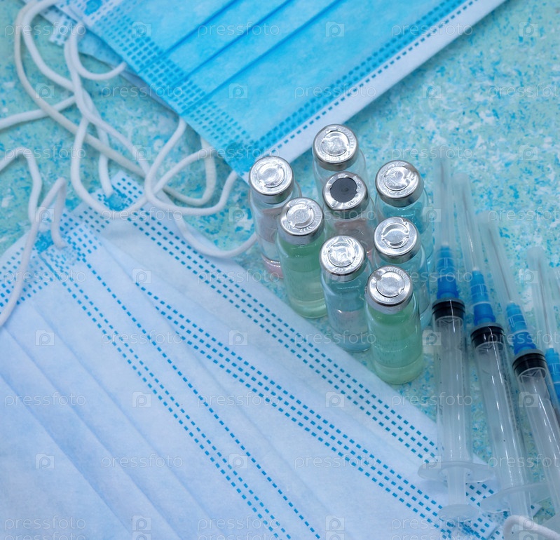 Медицинские инструменты на синем фоне. Ампула лекарства и шприц. Медицинская маска и вакцина
