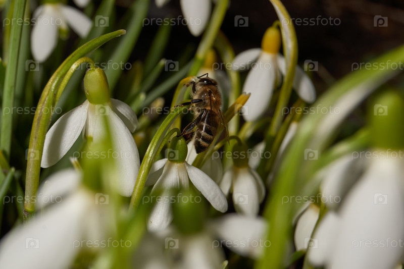 На лужайке в саду цветут подснежники. символ весны. род многолетних трав семейства Амариллидовых (Amaryllidaceae)