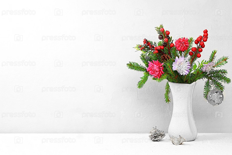 Рождественский креативный букет из живых еловых веток в вазе, с цветами хризантем и самодельными украшениями на элегантном праздничном фоне. Рождественский и новогодний эко-макет для дизайна и демонстрации продукции, концепция сочельника,