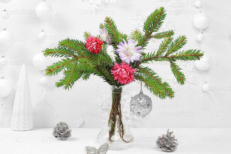 Рождественский креативный букет из живых еловых веток в вазе, с цветами хризантем и самодельными украшениями на элегантном праздничном фоне. Рождественский и новогодний эко-макет для дизайна и демонстрации продукции, концепция сочельника, выборочный фокус