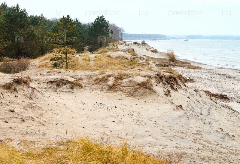 Песчаная дюна у моря, песчаные дюны и холмы на побережье, песчаная дюна и сосновый лес у моря