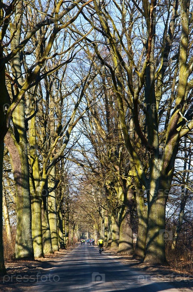 Старая аллея гладких деревьев по краям дороги, гладкая дорожка для автомобиля, большие старые деревья вдоль обочины