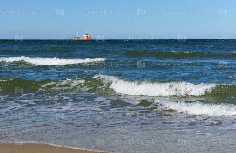 Корабль в море на горизонте, морские волны на пляже, шторм в Балтийском море