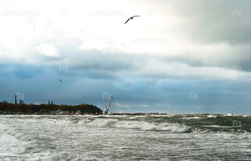 Шторм на море, волны накрывают причал, сильный шторм в Балтийском море
