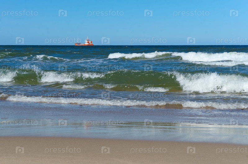 Корабль в море на горизонте, морские волны на пляже, шторм в Балтийском море