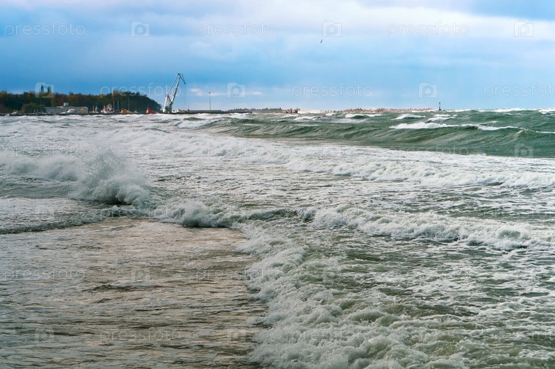 Морские волны. Плохая погода на берегу моря. Балтийское море. Облака в небе
