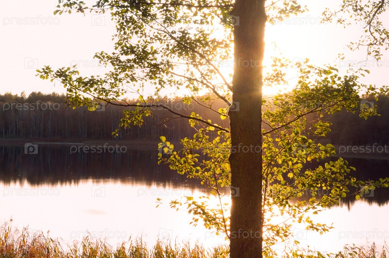 Закат, солнце отражается в воде, солнце пробивается сквозь деревья