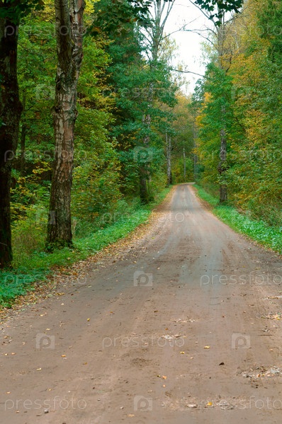 Лесная дорога среди высоких деревьев, дорога в лесу между высокими хвойными и лиственными деревьями
