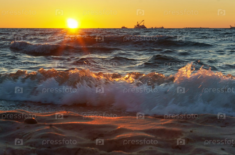 Закат на море, волны бьются о волнорез, море на рассвете, корабли на горизонте