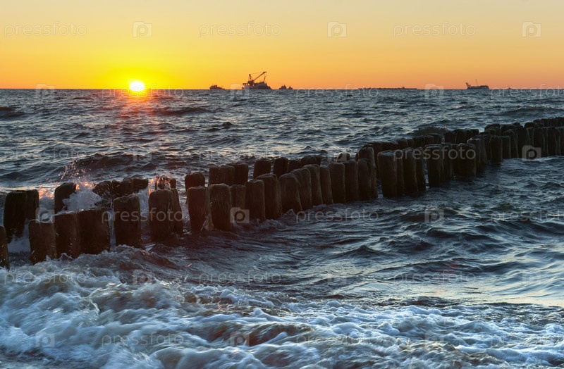 Закат на море, волны бьются о волнорез, море на рассвете, корабли на горизонте