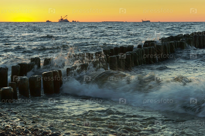 Закат на море, волны бьются о волнорез, море на рассвете, корабли на горизонте