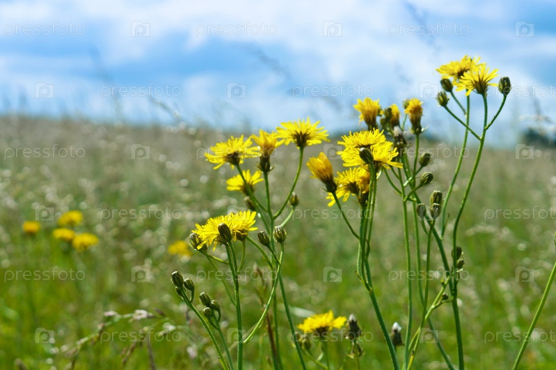 Полевые цветы, сиреневые, желтые и белые луговые цветы и травы