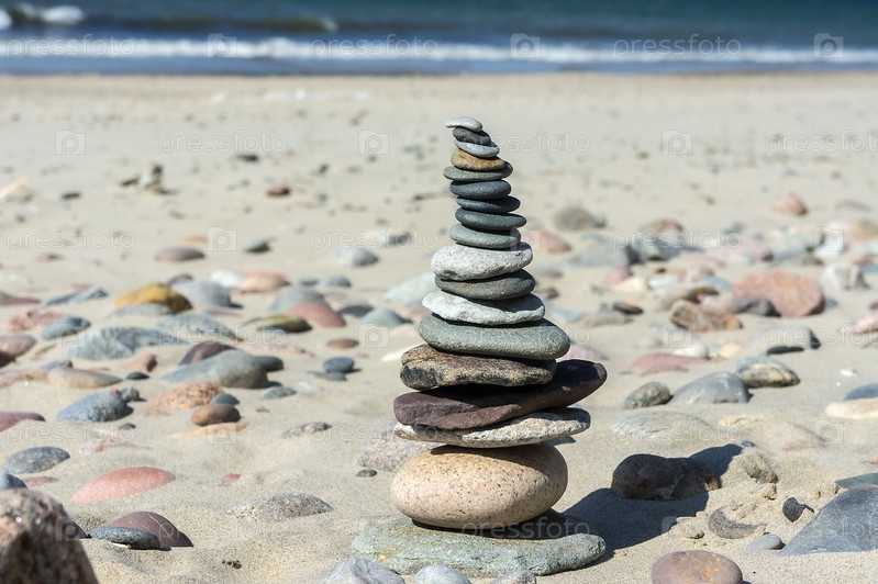 Морские камни, сложенные один на другой, пирамида из плоских камней, камни на морском песке