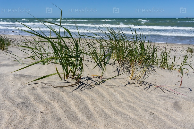 Песчаный берег моря, травяная осока на балтийском пляже, пустынный песчаный пляж в солнечный день