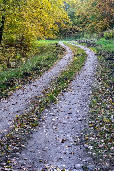 Осенний лес, поворот лесной тропинки, пустынная дорога в осеннем парке