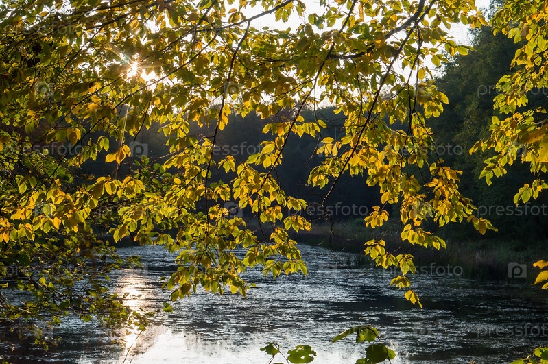 Лесное озеро, свисающие ветки над прудом, осенний пейзаж в лесу