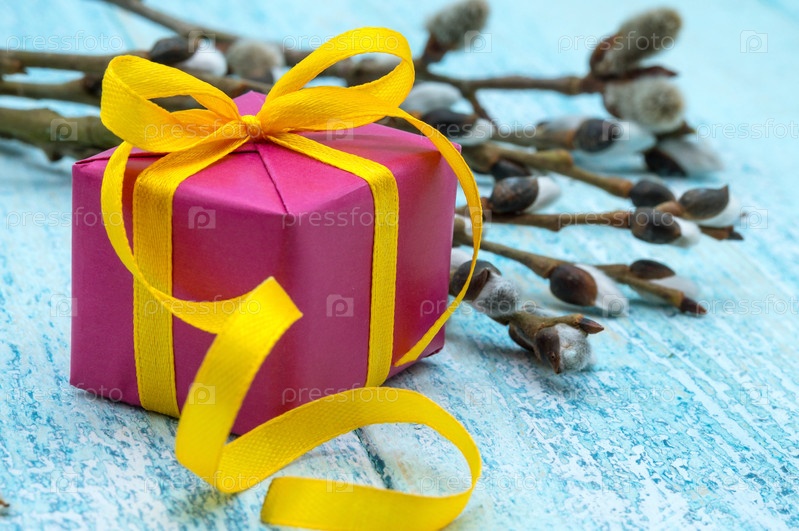 Подарочные коробки с желтыми лентами. Веточки ивы