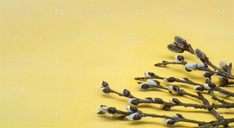 Веточки ивы. Желтый фон. Весенняя открытка
