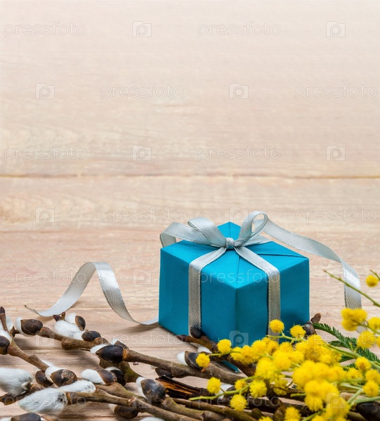 Желтая мимоза и пушистая ива. Подарок на деревянном фоне