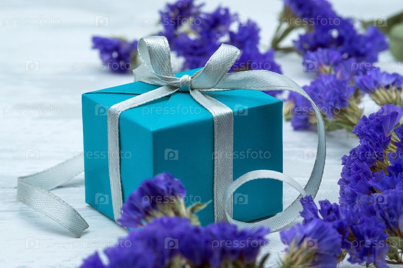 Синяя коробочка с серой лентой. Подарочная упаковка и синие цветы