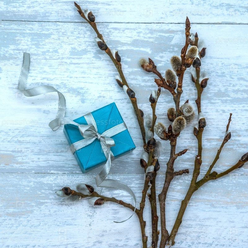 Синяя коробочка с серой лентой. Подарочная упаковка и ветки ивы