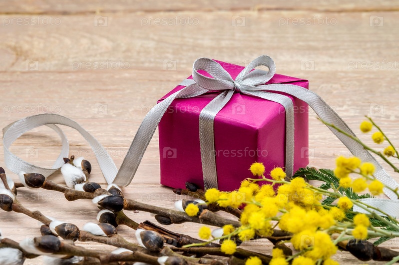 Желтая мимоза и пушистая ива. Подарок на деревянном фоне