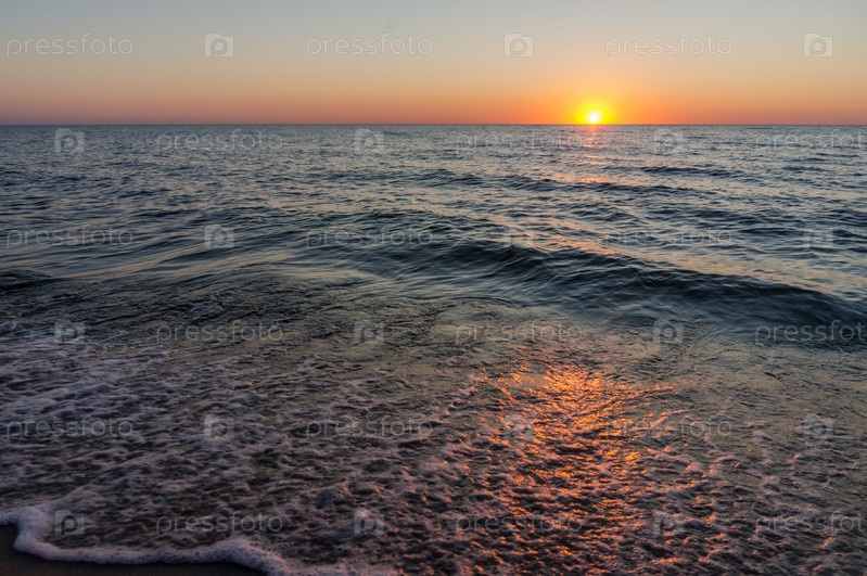 Закат на берегу моря. Солнце садится за морской горизонт