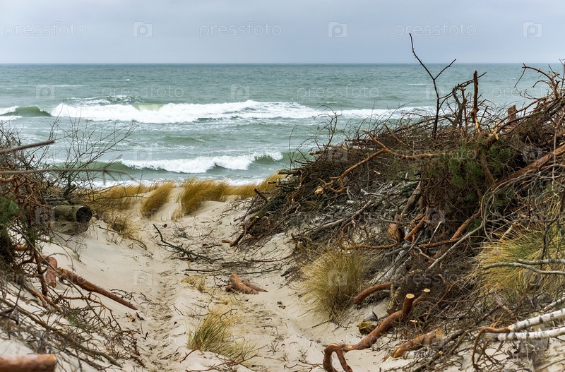 Песчаная дюна Балтийского моря. Укрепление песчаных морских берегов. Национальный парк Куршская коса, Россия