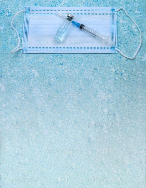 Медицинские инструменты на синем фоне. Ампула лекарства и шприц. Медицинская маска и вакцина