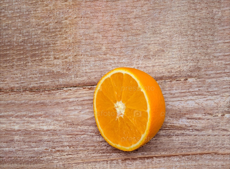 Половина апельсина на деревянном столе. Баннер с оранжевым. Апельсин на деревянном фоне